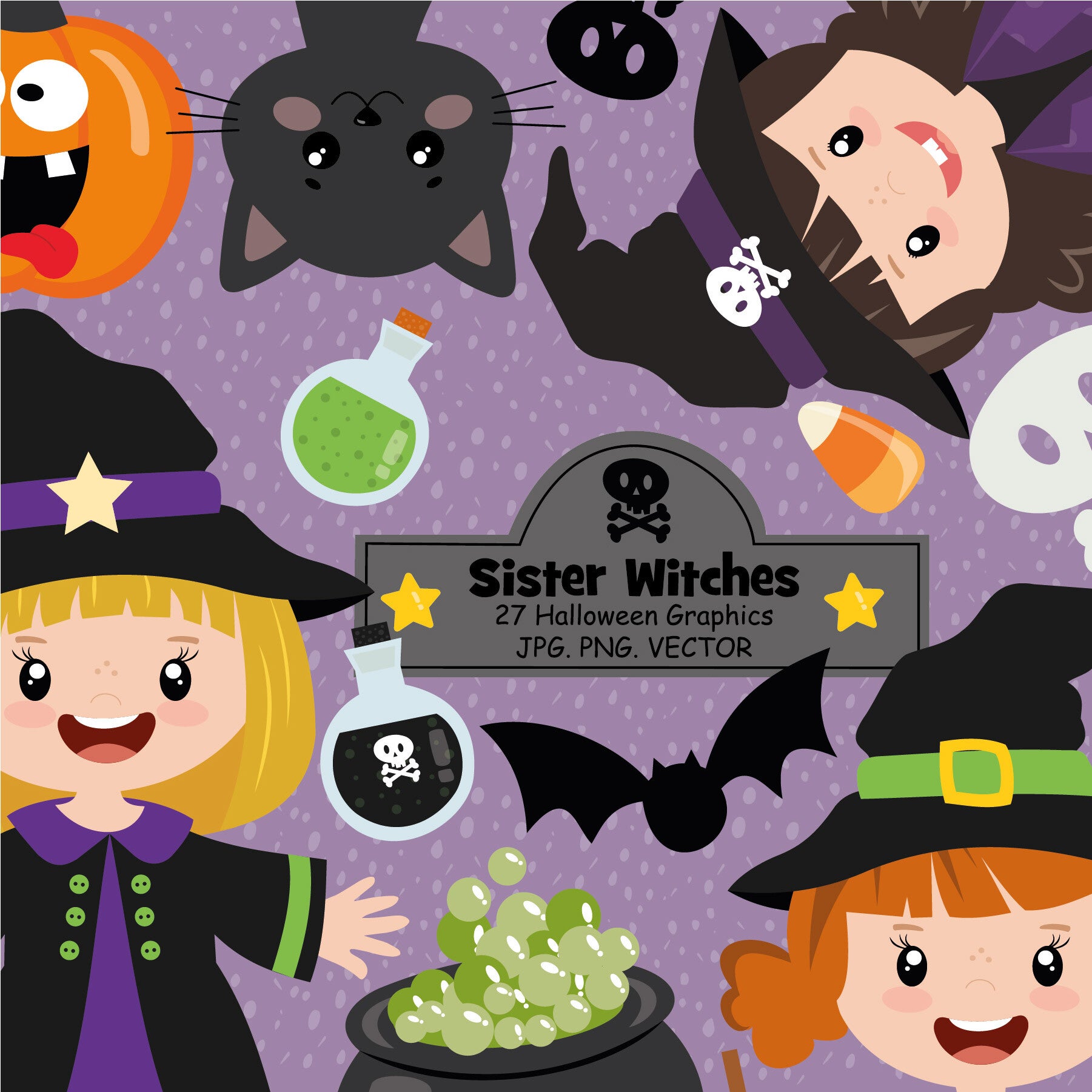 Celebrate in style with our delightful pack of 27 adorable clipart graphics, all centered around a vibrant Halloween theme. This collection features charming word art and whimsical illustrations that are perfect for designing invitations, party decor, stickers, t-shirts, and much more—the possibilities are endless! Each graphic is meticulously crafted and saved at 300dpi in PNG, JPG, and EPS vector formats, ensuring high-quality results. Plus, commercial use is absolutely permitted, making it an ideal choice for entrepreneurs and crafters alike. Once you complete your checkout, you can download your creative assets immediately and start bringing your crafty projects to life!